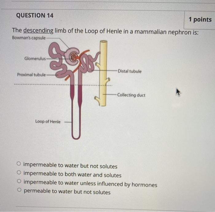 Solved 11.The descending limb of the loop of Henle(nephron - Chegg Anatomy and Physiology questions and answers, 11.The descending limb of the loop of Henle (nephron loop): a) is not permeable to water b) pulls salt in c) fluid becomes more concentrated as it moves down d) pulls water in e) b and c,