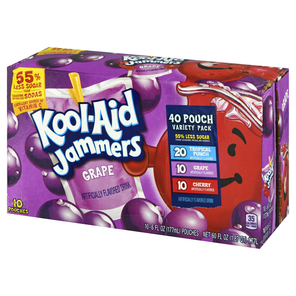 Kool-Aid Jammers (6 fl oz) Delivery or Pickup Near Me - Instacart Details. Kool-Aid Jammers artificially flavored Orange Drink Pouches deliver fun with a sweet blend of orange flavor. Our delicious orange artificially flavored drink contains 75% less sugar than leading regular sodas (per 12 fl oz, this product 10g total sugar, leading regular sodas 40g total sugar), making it a great fruit flavored drink for kids to enjoy.