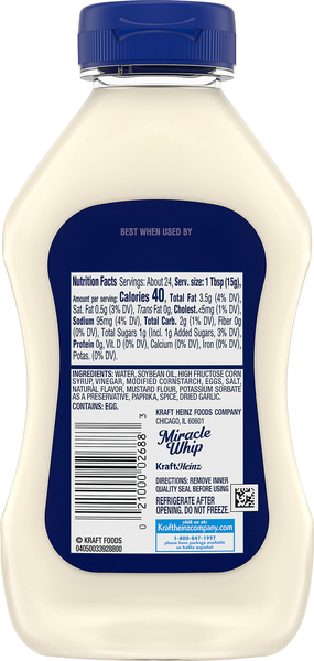 Miracle whip ingredients label. Miracle Whip Ingredients List : Top Picked from our Experts - RecipesChoice Ingredients Miracle Whip is made from water, soybean oil, high-fructose corn syrup, vinegar, modified corn starch, eggs, salt, natural flavor, mustard flour, potassium sorbate, spice, and dried garlic. Advertising 1948 advertisement Six Flags announced a new partnership with the Miracle Whip brand in 2009. Kraft Miracle Whip Dressing Original Allergy and Ingredient Information Kraft Miracle Whip Dressing Original Made By: Kraft SKU/UPC CODE: #021000026494 PRODUCT DESCRIPTION: 3.5g fat and 40 calories per servingNo artificial flavorsKosher INGREDIENTS and MAY CONTAIN STATEMENTS: Signup to Read the Label It looks like Kraft Miracle Whip Dressing Original is Free From a total of: 11 different TOP 14 Allergens Is Miracle Whip Gluten Free? Truth! - Nothing Gluten Miracle Whip is made from water, high-fructose corn syrup, soybean oil, modified cornstarch, vinegar, eggs, natural flavor, salt, spices, mustard flour, potassium sorbate, and dried garlic. Although the base ingredients and texture of both mayo and Miracle Whip are the same, both these sauces have considerable differences. Miracle Whip vs. Mayo: What's the Difference? - Daring Kitchen Miracle Whip takes its iconic flavor from seasoning ingredients like paprika, garlic, mustard powder, and of course, plenty of salt. The exact amounts of these ingredients are unknown and other important flavorings are simply listed on the ingredients label as "spice", making the exact recipe for Miracle Whip a trade secret!