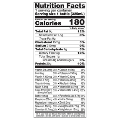 SlimFast High Protein Nutrition Shakes – Shop SlimFast Nutrition Facts 1 servings per container Serving Size 1 bottle (325 mL) Amount per serving Calories 180 % Daily Value* Total Fat 9g 12% Cholesterol 15mg 5% Sodium 180mg 8% Total Carbohydrate 7g 3% Dietary Fiber 5g 18% Total Sugars 1g Included 0g 0% Added Sugars Protein 20g 40% Vitamin D 6.7mcg 35% Calcium 440mg 35% Iron 6mg 35% Potassium 770mg 15%