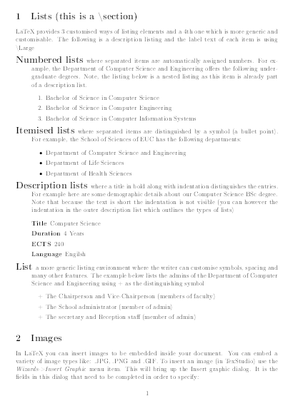 How to get a list of all the labels in a LaTeX document in WinEdt Enter the name of your latex file. (For example, if the name of your latex file is myfile.tex then type myfile .) (2) It will ask you to type the document class. Enter the document class. (For example, if your document class is article then enter article) Changing style of latex description lists - Stack Overflow The formatting of description labels is controlled by the command \descriptionlabel. Here's an example of changing to italics, no bold: \renewcommand {\descriptionlabel} [1] {\hspace {\labelsep}\textit {#1}} To change the formatting of the label to something else, change the \textit {#1} part above. LaTeX list - Enumerate and Itemize - LaTeX-Tutorial.com Using lists in LaTeX is pretty straightforward and doesn't require you do add any additional packages. For unordered lists, LaTeX provides the itemize environment and for ordered lists there is the enumerate environment. The elements within both environments have to be declared beginning with the \item command. Reference name of description list item in LaTeX - Stack Overflow Reference name of description list item in LaTeX. I'd like to refer to a description list item by name instead of number. To that effect, I've added labels to each item, but when referencing them I only get the name of the section, not of the list item.